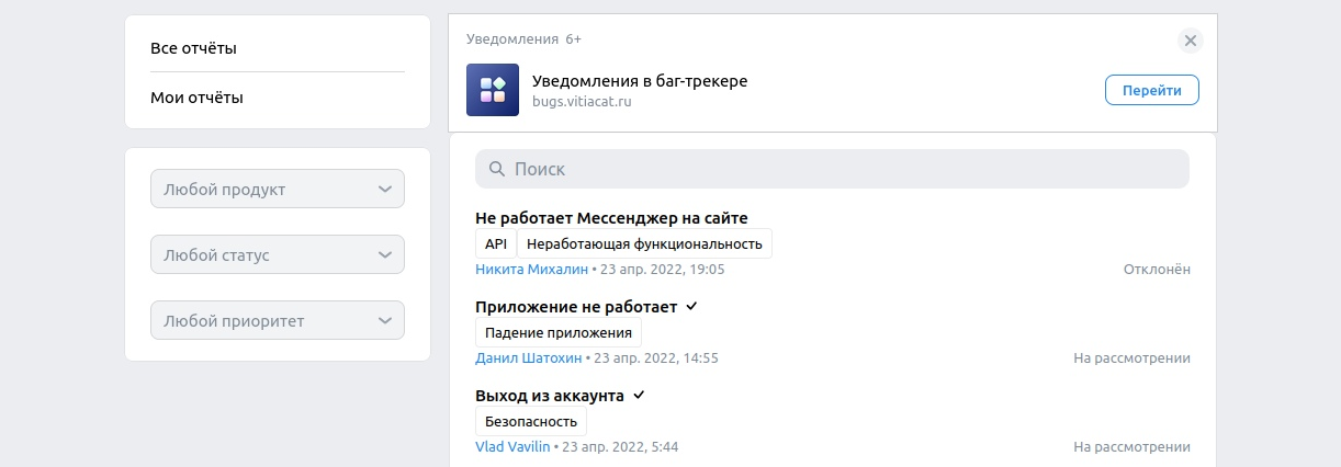 Баг-трекер, вдохновленный аналогичной системой ВКонтакте. Реализован функционал создания отчетов по продуктам, комментирования, начисления баллов за отчеты и инструменты для модерации.