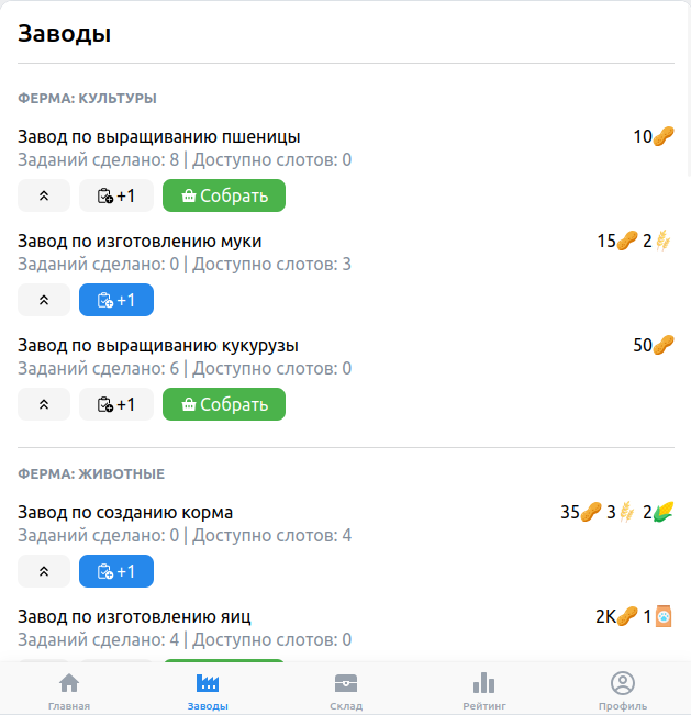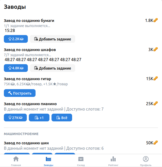 Мой первый проект на React. Игра-кликер, в которой игроки строили заводы, производили и продавали товары. Включала в себя донат, систему рейтинга и компании. Была опубликована в каталоге мини-приложений ВКонтакте.